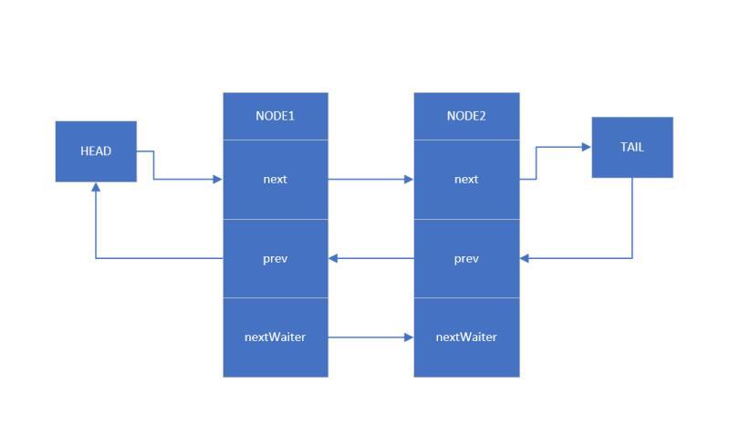 这个是AQS内部维护的FIFO链表的示意图,我们可以看出每个节点会维护一个prev和一个next指针来维护双向链表。除此之外addWaiter额外维护了一个单向链表用于Condition的操作。每个Node节点内部会封装一个线程,当线程争抢锁失败后会封装成Node加入到ASQ队列中去。