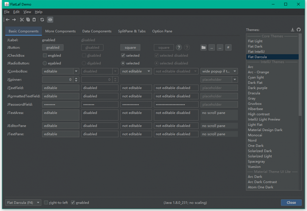 FlatLaf官方介绍说本库是用于Java Swing桌面应用程序的现代的开源的跨平台的外观库。整个UI都是扁平化风格,支持Light、Dark、IntelliJ、Darcula和一些自己配色的主题,Java 8以上支持高DPI,无依赖,支持MigLayout布局,整合得挺好的。自己运行了一下官方demo,暗色主题效果和IDEA非常相近: