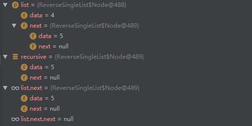 从图中看到, list 为 4->null , recursive 为 5->4->null ,咱们来看看程序的结果,是不是和图相符: