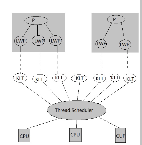 (说明:KLT即内核线程 Kernel Thread ,是“内核分身”。每一个KLT对应到进程P中的某一个轻量级进程 LWP (也即线程),期间要经过用户态、内核态的切换,并在 Thread Scheduler 下反应到处理器 CPU 上。)