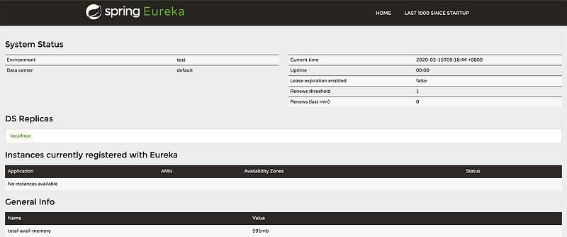 我们在项目中引入 Eureka Server 的相关依赖,然后在启动类加上注解 @EnableEurekaServer ,就可以将其作为注册中心,启动服务后访问页面如下: