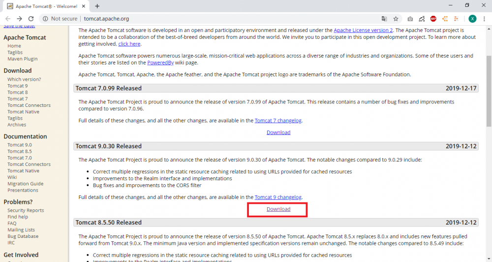 前往 官网 ( http://tomcat.apache.org/ )下载,图是刚刚截的,最新版是 9.0.30,我之前下载的是 9.0.26,没影响,你也可以下载 Tomcat7 。