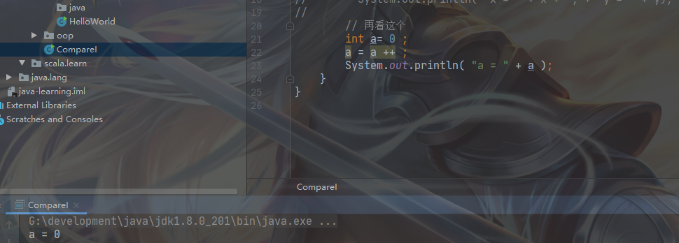 int a= 0 ; a = a ++ ; System.out.println( "a = " + a );