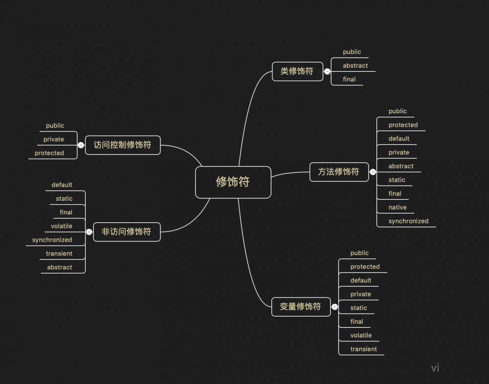 修饰符是用于限定类型以及类型成员申明的一种符号,从修饰对象上可以分为类修饰符,方法修饰符,变量修饰符;从功能上可以划分为访问控制修饰符和非访问修饰符。访问修饰符控制访问权限,不同的访问修饰符有不同的权限范围,而非访问修饰符则是提供一些特有功能。