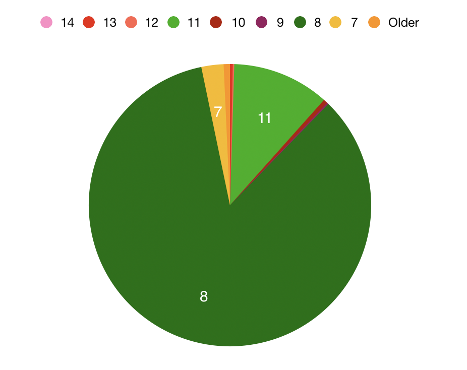 特别得,该报告重点指出,在生产环境中运行的大多数 JVM 都使用的是 Java 的 LTS 版本;只有 11% 多一点运行在 Java 11 上。大多数 JVM(超过 85%)运行在 Java 8 上,Java 7 紧随其后,只有几个百分点。非 LTS 版本仅占所报告的运行机器的 1% 多一点。此外,报告还特别指出,JVM 用户在生产环境中的升级速度通常很慢;在 7 之前的 Java 版本上运行的 JVM 比在 9 或 10(都已 EOL)或 12 和 13(都已 EOL 或即将 EOL)上运行的版本还多。该报告还强调,许多 JVM 运行在过时的 Java 8 版本上,其中一些存在已知的安全漏洞。