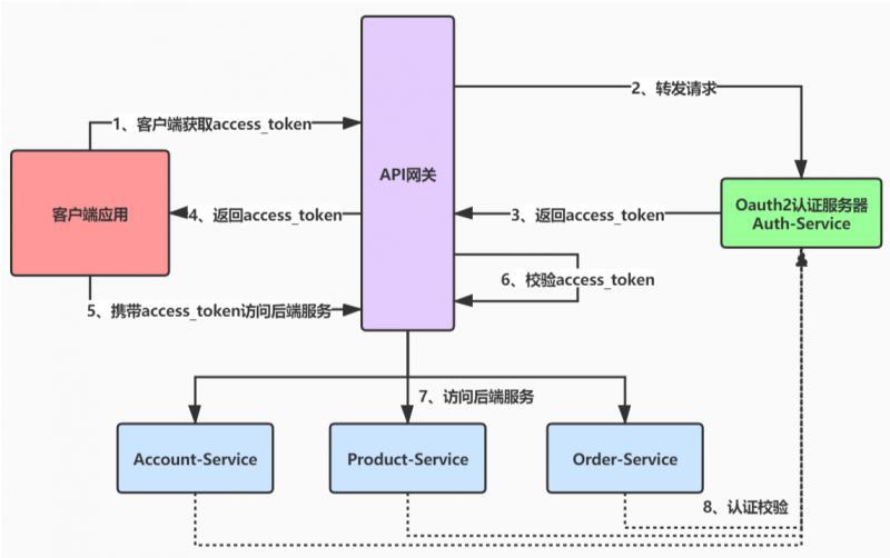 在网关集成Oauth2.0后,我们的流程架构如上。主要逻辑如下: