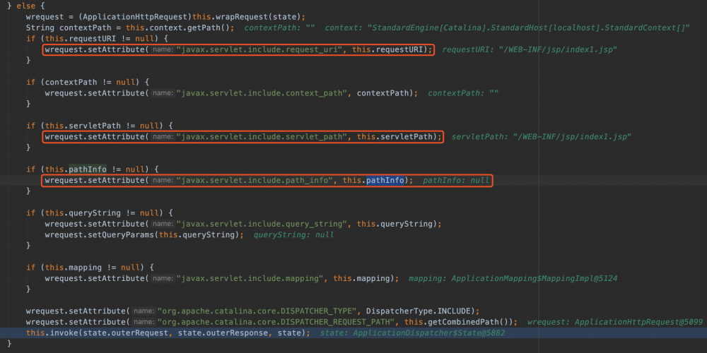 答案:其实是不可以的。因为spring mvc会将模版渲染后,交个JspServlet去解析之前,调用 org.apache.catalina.core.ApplicationDispatcher#doInclude 方法对3个include属性进行重新赋值,也就是把我们之前设置的值覆盖掉了不再可控!