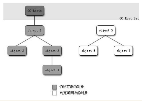 以被称为“GC Roots”的对象为起点,从这些节点向下搜索,搜索的路径被称为引用链。 当对象没有任何的引用链与“GC ROOTS”相连 ,则该对象则被判定为可回收对象。