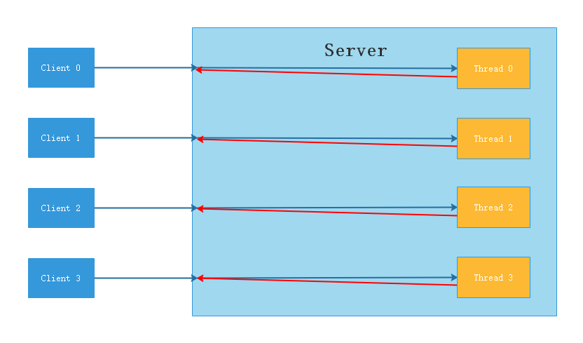 服务器实现模式为 一个连接一个线程 ,即客户端有连接请求时服务器端就需要启动一个线程进行处理,如果这个连接不做任何事情会造成不必要的线程开销,当然可以通过线程池机制改善。