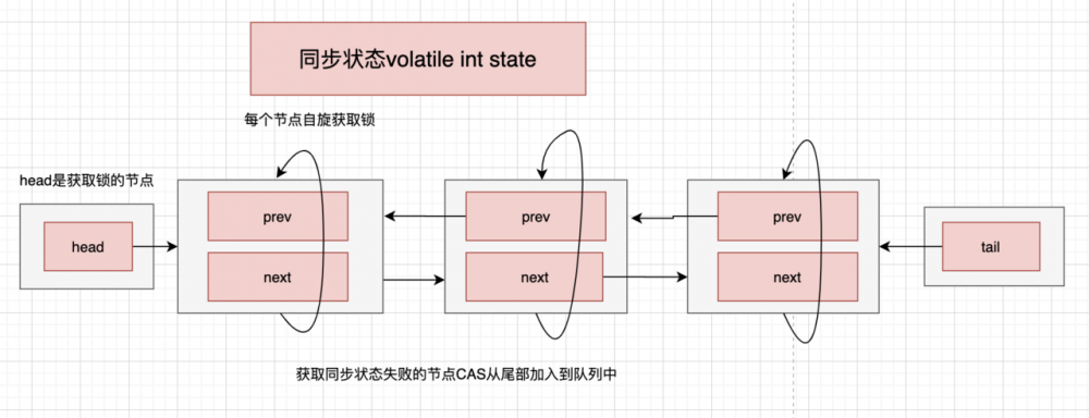 如下图所示是队列同步器的基本结构,通过一个int类型的state对象来表示同步状态,对锁的竞争就是通过修改这个同步状态和对这个状态的值来进行判断实现,使用一个FIFO双向队列来管理竞争同步状态的线程,把这些线程封装成一个队列节点加入到队列中。