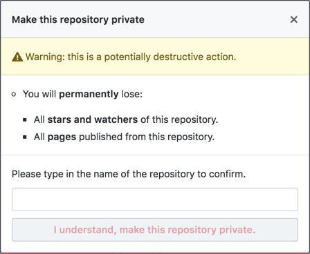 警告:公共仓库设为私有时,将分离该公共仓库的公共复刻并放入新网络中。 公共复刻无法设为私有。 更多信息请参阅