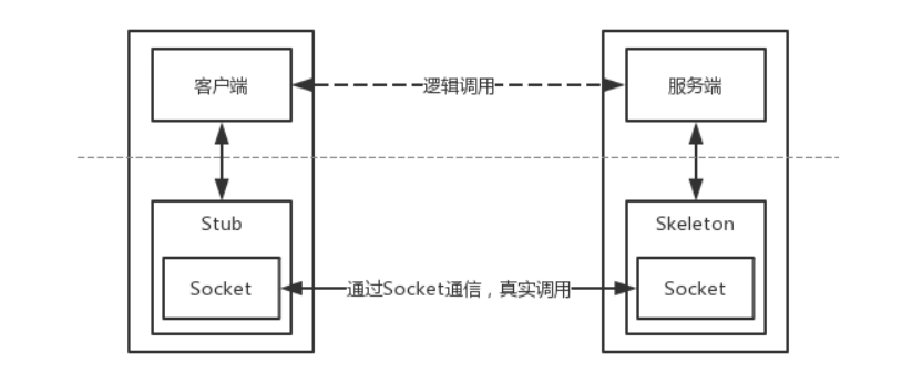 客户端调用stub(存根上的方法),存根负责将要调用的远程对象方法的方法名以及其参数编组打包,并且通过Socket通信发送给Skeleton,Skeleton将客户端发送过来的数据包中的方法名以及编组的参数进行解析,并且在服务端将此方法执行,执行完毕后将返回值通过相反的路径返回给客户端Stub,Stub将返回结果解析后给客户程序。