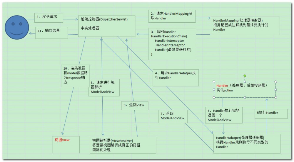 Handler 是继DispatcherServlet前端控制器的后端控制器,在DispatcherServlet的控制下Handler对具体的用户请求进行处理。