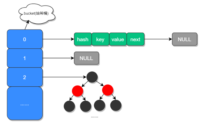 可以看出每个哈希桶中包含了四个字段:hash、key、value、next,其中 next 表示链表的下一个节点。