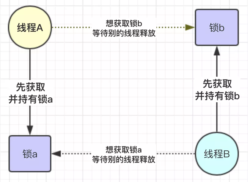 死锁的本质,举个例子如果此时有一个线程 A ,按照先获持有锁 a 再获取锁 b的顺序获得锁,同时另外一个线程 B,按照先获取锁 b 再获取锁 a 的顺序获取锁。如下图所示: