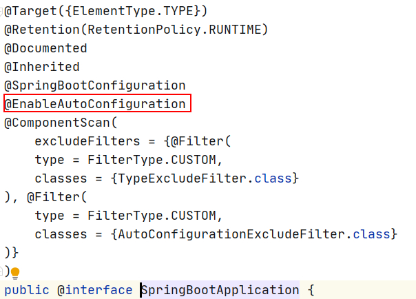 SpringBoot项目启动类上都会添加 @SpringBootApplication 注解,这个注解是个组合注解,他的核心功能是开启自动配置注解 @EnableAutoConfiguration ,如下图所示: