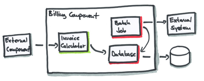 具有外部和内部依赖性的模块。开票组件将发票计算器暴露在外面。发票计算器生成特定客户和时间段的发票。为了使发票计算器正常工作,它需要在日常批处理作业中同步来自外部订单系统的数据。此批处理作业从外部源中提取数据并将其放入数据库中。