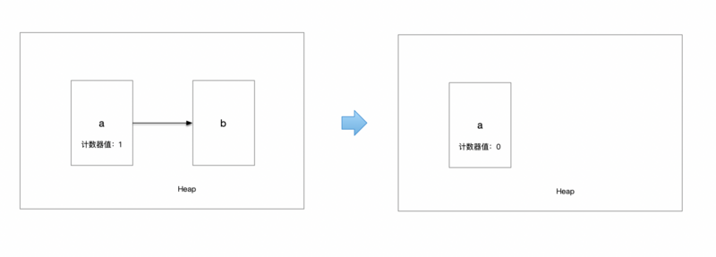 引用计数法的原理很简单,就是在对象中维护一个计数器,当有一个对象引用它的时候,该计数器的值就会加一,当这个引用失效的时候,计数器的值就会减少一,当计数器的值为零的时候,就意味着这个对象是一个垃圾对象,需要被 GC 回收,这个算法是一个比较高效的算法,但是会存在一种对象循环引用导致内存泄露的问题,什么是循环引用呢?