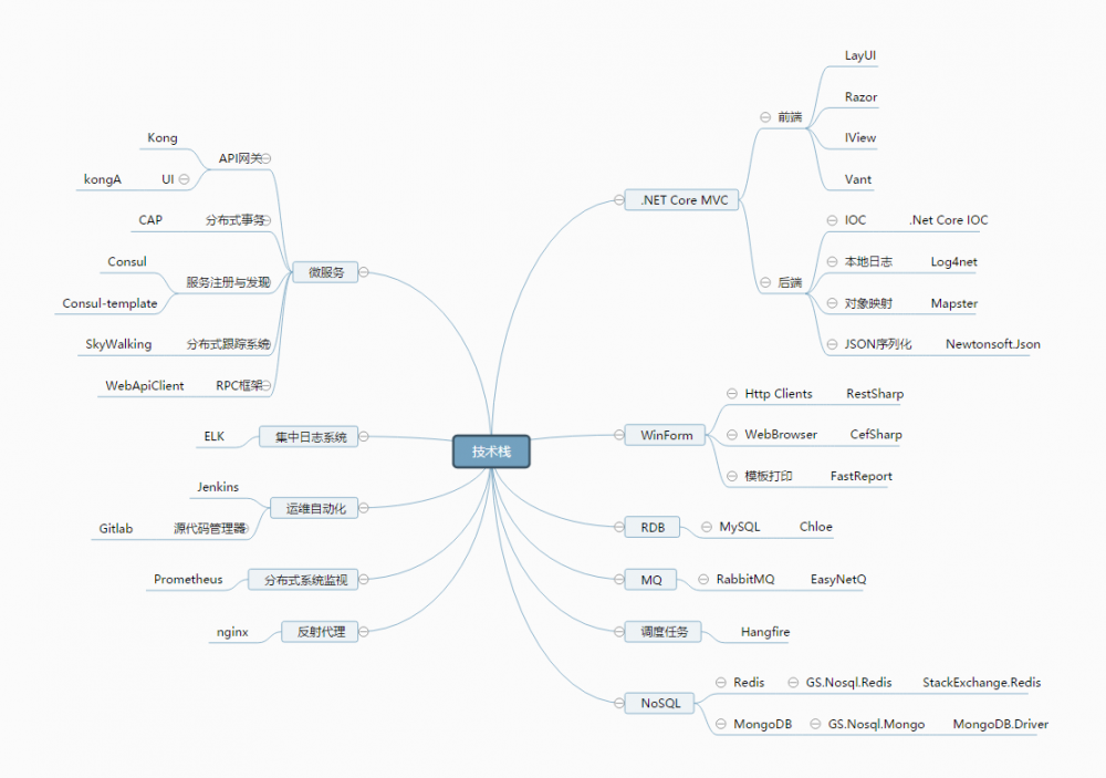 以上是我们公司的技术栈(点击图片可在浏览器打开),除了统一配置中心没有服务器资源和Hangfire还没场景使用外,其他都已经上线使用了。