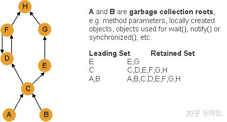 在下面这张图中,A和B是gc roots中的节点(方法参数、局部变量,或者调用了wait()、notify()或synchronized()的对象)等等。可以看出,E的存在,会导致G无法被回收,因此E的Retained set是E和G;C的存在,会导致E、D、F、G、H都无法被回收,因此C的Retined set是C、E、D、F、G、H;A和B的存在,会导致C、E、D、F、G、H都无法被回收,因此A和B的Retained set是A、B、C、E、D、F、G、H。
