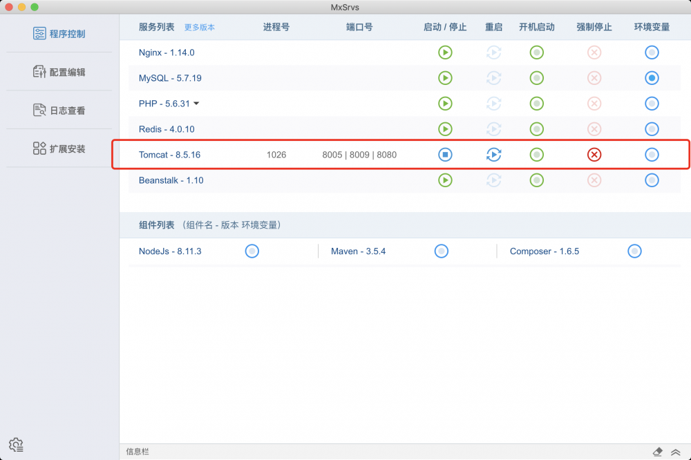 Mac下的MxSrvs预装了Tomcat 8.5.16版本,可以直接使用