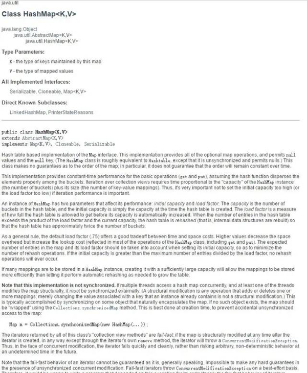 基于哈希表的 Map 接口的实现。此实现提供所有可选的映射操作,并允许使用 null 值和 null 键。(除了不同步和允许使用 null 之外,HashMap 类与 Hashtable 大致相同。)此类不保证映射的顺序,特别是它不保证该顺序恒久不变。