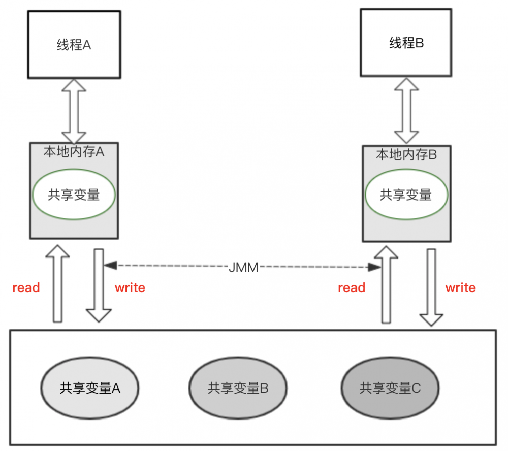 除此之外,内存模型还描述了多线程对于共享变量的读写机制,前面的文章我们也提到过,那这里就在啰嗦一遍。Java内存模型规定了所有的变量都存储在主内存中,每条线程还有自己的工作内存。线程的工作内存中保存了该线程中用到的变量的主内存副本拷贝,线程对共享变量的所有操作都必须在工作内存中进行,不能直接操作主内存变量,而是将变量拷贝到本地内存中,在本地内存操作完成以后,再将结果同步回主内存,不同的线程之间也无法直接访问对方工作内存中的变量。