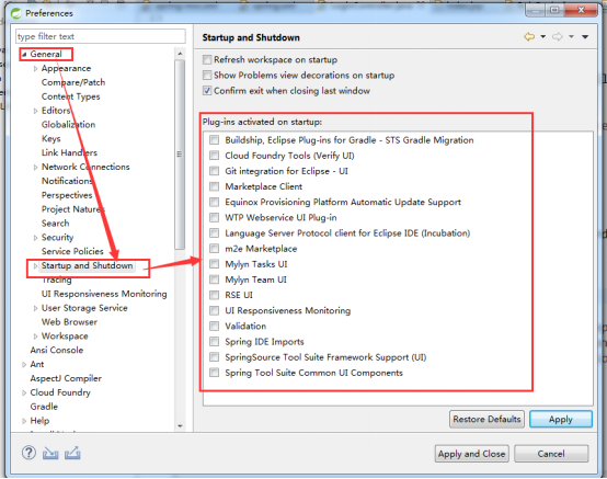 进入 STS IDE 工具,然后依次点击上面 Window -> Preferences -> General -> Startup and Shutdown 将不必要的插件取消启动,只需需要勾选即可(也可以全部取消),如下图: