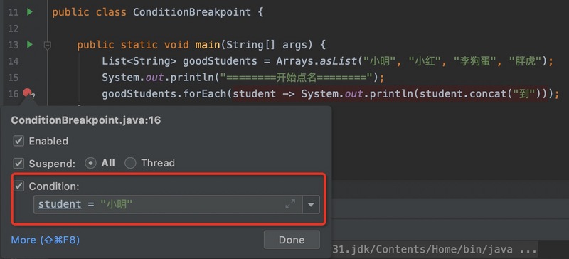 右击断点旁边的小红点(断点),弹出面板,在 Condition 这里填入暂停条件,这样调试时,当程序满足条件时就会稳稳地停在 student= "小明" 的位置。