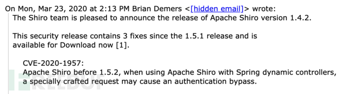 2020年3月23号,Shiro开发者Brian Demers在 用户社区 发表帖子,提醒shiro用户进行安全更新,本次更新进行了三个修复,其中就包括了对编号为CVE-2020-2957的Shrio授权绕过漏洞的修复。漏洞影响shiro 1.5.2版本以下。