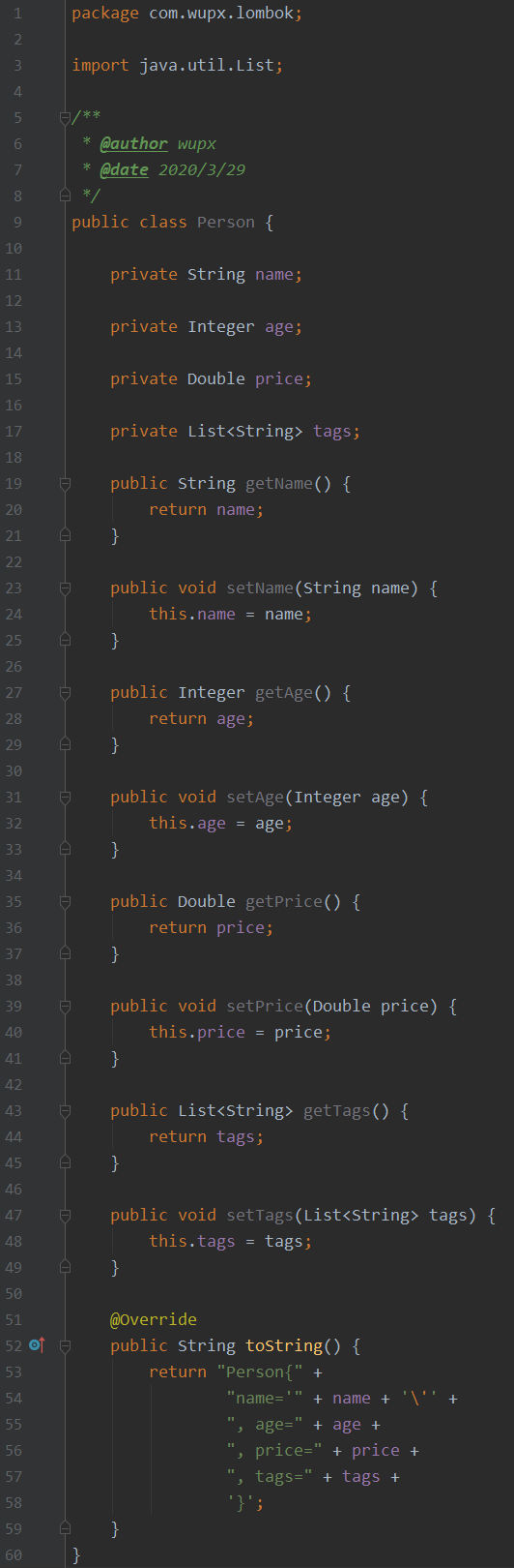 在介绍之前,先通过是否使用 Lombok 的效果来看下对比,首先来看下没有 Lombok 之前,我们的一个简单的 Java 对象(POJO)是长什么样子的: