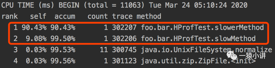 指令运行完,打开 hprof.txt 便很容易统计出哪些方法的运行耗时较长。