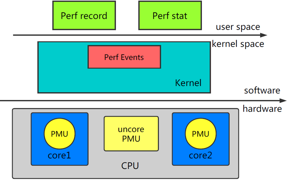 内核依赖的硬件,比如说 CPU ,一般会内置一些性能统计方面的寄存器( Hardware Performance Counter ),通过软件读取这些特殊寄存器里的信息,我们也可以得到很多直接关于硬件的信息。 perf 最初就是用来监测 CPU 的性能监控单元(performance monitoring unit, PMU)的。