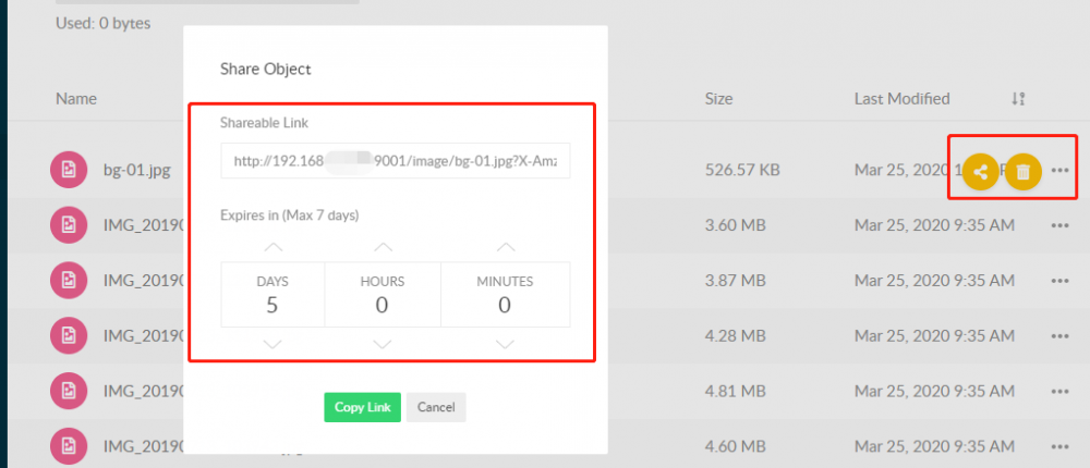 在浏览器中登录到 MinIO 存储系统,点击右下角创建 bucket 来存储对象,分别创建对应的 bucket 以存放静态资源:image,video,audio。这样,就可以按资源类型在对应的 bucket 中进行文件上传了,上传后可以把文件分享,其它地方可以通过分享的 url 获取资源,如下图所示。