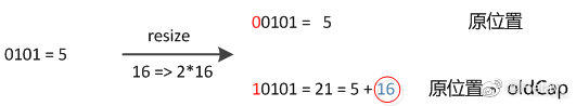 即红色所示的高位为0,还是原来的索引位置;为1,索引变为原索引+旧容量。