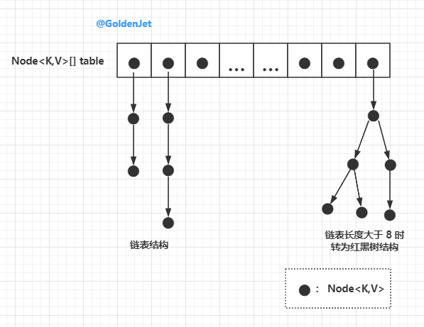 HashMap 的结构,是数组+链表+红黑树的结构,草图可以见下图。