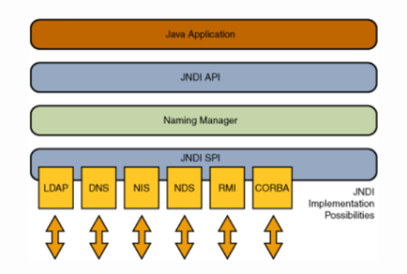 可以理解为一个Java抽象出来统一与命名服务或者目录服务交互的接口。比如需要访问DNS服务、LDAP服务、RMI等,都可以通过一层抽象JNDI的API接口进行统一的处理。