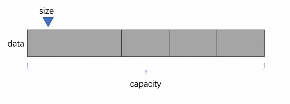 由于数组本身是静态的,在创建的时候需指定大小,此时我将这个大小用变量 capacity 表示,即容量,表示数组空间最多装几个元素。但并不需要在类中声明,只需在构造函数的参数列表中声明即可,因为 数组的容量也就是 data[] 的长度 ,不需要再声明一个变量来进行维护。
