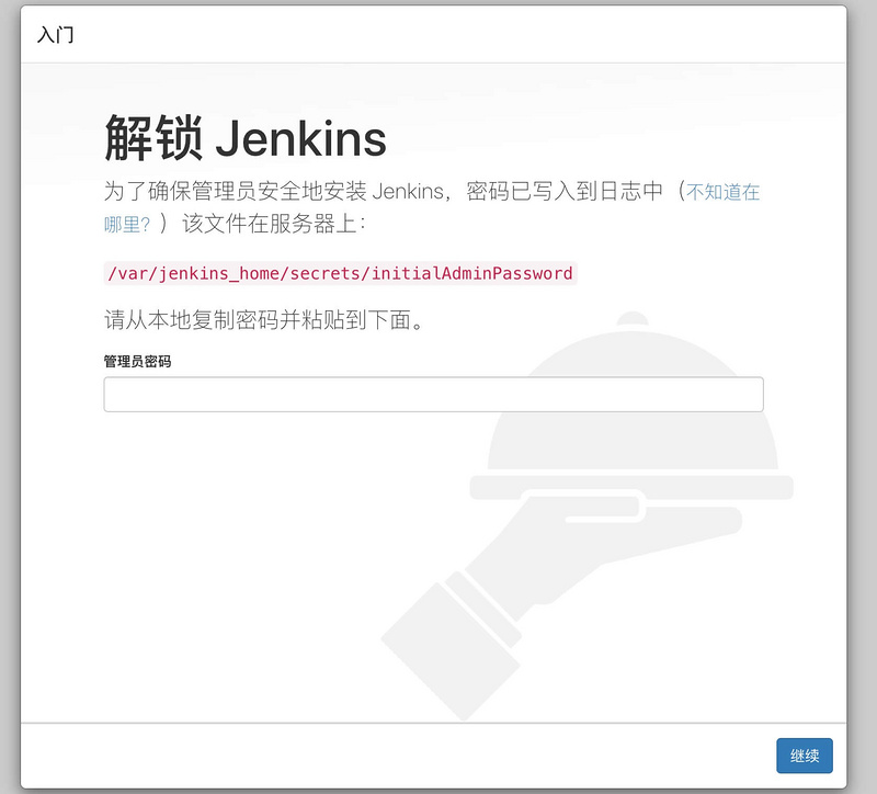 这个时候我们就可以到刚才管理数据卷的文件夹里找了(我本地是 /Users/zhouatie/Desktop/github/front-end/practise-jenkins/secrets/initialAdminPassword ), cat 下这个文件可以看到输出 28023d3751214bd6aadc0dd83c168325 ,把这个密码复制到管理员密码输入框中并点击继续。