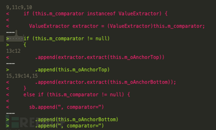 所有针对extract()方法的调用都被从toString()方法中移除了。extract()方法的重要性我们暂时先不做讨论,而这种修改的有趣之处就在于,各种标准的JRE类都可以通过readObject()方法来调用和访问toString()方法,比如说BadAttributeValueExpException: