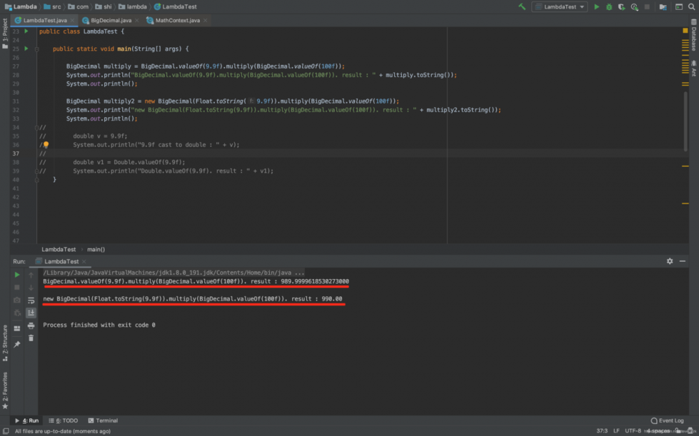 看结果是没问题的。但是,注意BigDecimal.valueOf(...)的源码,其内部依然是把入参转换了double数据对应的字符串。 假如直接使用new BigDecimal(double val)构造函数来进行运算,则会发现计算结果发生来精度异常。如下图所示。
