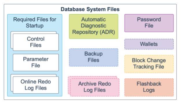 •备份⽂件:这些可选⽂件⽤于数据库恢复。通常,当介质故障或⽤户错误损坏 或删除原始⽂件时,可以还原备份⽂件。