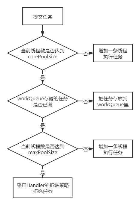 当我们往线程池里提交任务时,如果线程池内的线程数少于corePoolSize,则会直接创建新的线程处理任务;