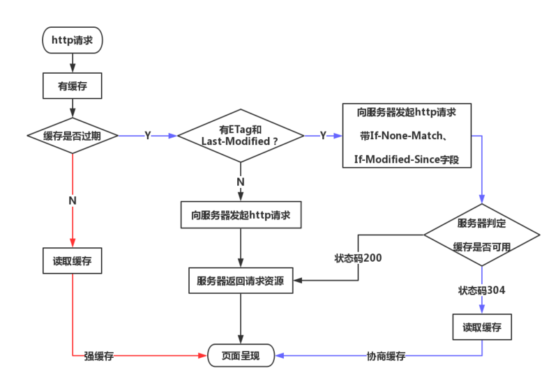 下面假定浏览器已经访问了服务器,服务器返回了缓存相关的头部字段且浏览器已对相关资源做好缓存。通过下图来分析强缓存和协商缓存: