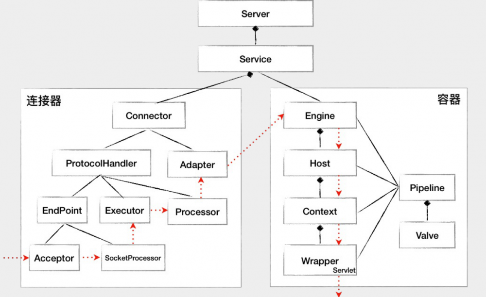 下图是对于Tomcat处理请求内部的流转过程.也描述了Tomcat组件的静态关系.