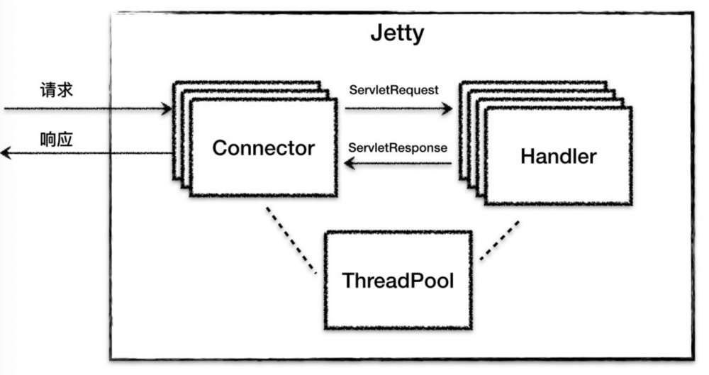 Jetty与Tomcat一样会分为HTTP服务器部分和Servlet容器部分,分别由Connector和Handler实现,而这两个组件会共用同一个线程池的资源.