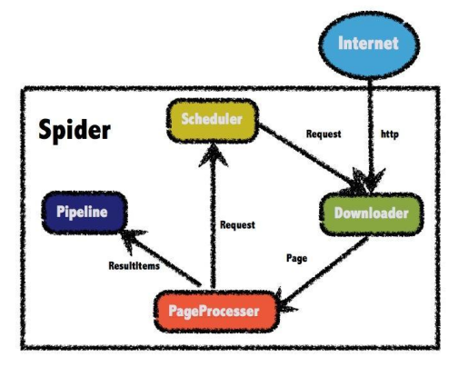 首先介绍一下其相应的四个组件及其功能,分别是:Pageprocessor(负责解析页面), Scheduler (负责管理待出去的 URL ), Pipeline (负责抽取结果处理,做持久化到数据库操作), Downloader (负责从网上下载页面)。下面是用一个图的直观介绍: