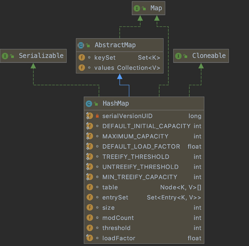 从上图中我们可以看出HashMap的父类以及一些属性。下面我抽取其中几个关键的属性进行说明: