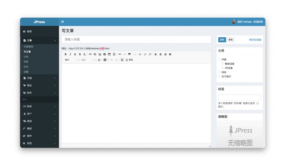 JPress 是一个使用 Java 开发的类似 WordPress 的产品,具有完善的模板和插件功能,并在此基础上新增了在线商城、会员中心以及和微信深度整合的功能。