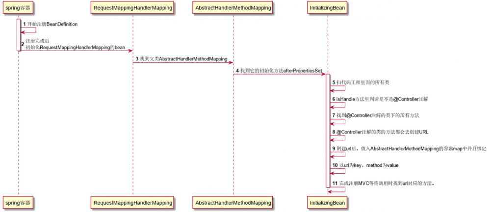 因为当经过上一节,逻辑找到你代码工程下符合创建简约MVC的类后,如找到UserContractImpl后,ContractAutoHandlerRegisterHandlerMapping的父类RequestMappingHandlerMapping逻辑会去找到UserContractImpl所有方法并进行创建url,然后绑定方法和url关系。(如流程图的第7~9步)